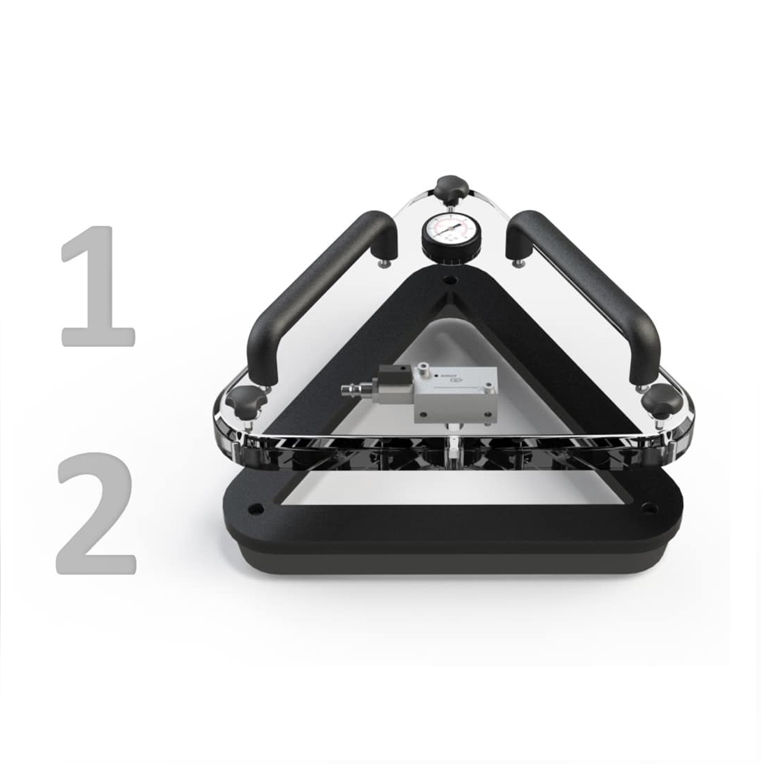 Notre boîte à vide peut fonctionner soit par compression grâce au système venturi, soit par aspiration grâce à notre pompe à vide optionnelle spécialement adaptée.
