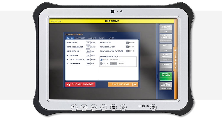 Le système DXB de JME communique et s'intègre également à l'ensemble de notre gamme de chenilles de pipeline CR2. Cela permet une communication bidirectionnelle entre le Pipeline Crawler et le DXB, donnant la configuration des paramètres clés du robot à partir de la tablette de contrôle DXB. Cette intégration permet également de commencer l'inspection en appuyant sur un seul bouton. L'opérateur DXB est en mesure de contrôler, d'ajuster et de visualiser l'état du robot CR2 à tout moment pendant une tâche d'inspection.