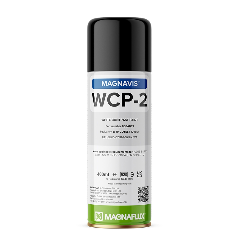 Peinture de contraste CND opaque blanc brillant, WCP-2 offre un arrière-plan offrant un contraste élevé destiné à améliorer la détection et la sensibilité pendant les inspections par particules magnétiques visibles.
