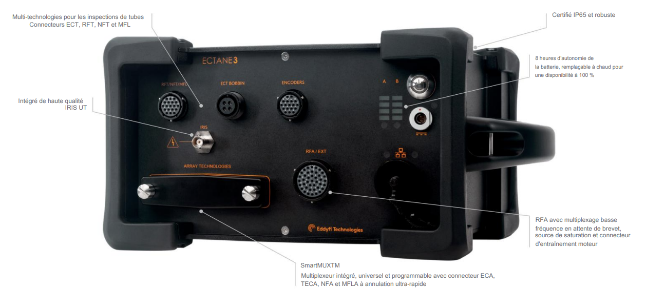 Avec plus d'un millier d'unités sur le terrain, l'Ectane 3 a permis de réaliser des inspections électromagnétiques avancées dans le monde entier depuis plus d'une décennie. L'unité de troisième génération est certifiée IP65 et prend en charge une dixième technologie, Remote-Field Array (RFA) pour les tubes avancés.